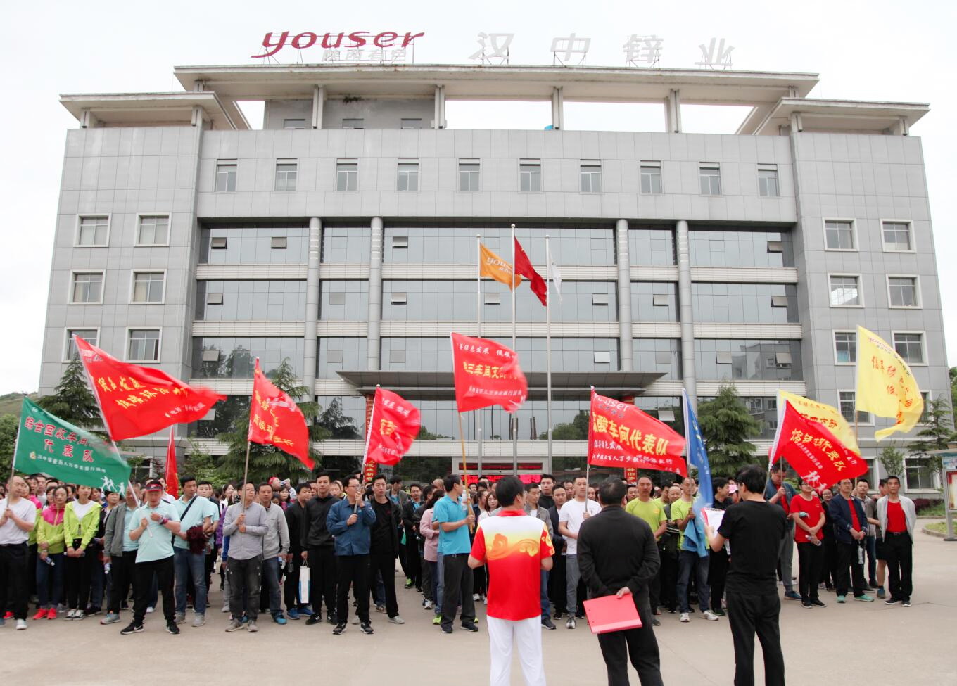 天氣陰沉,清風呼號,漢中的暮春依然有些寒意,卻絲毫阻擋不了大家火熱的激情。早上7時許,參賽隊員穿著各具特色的隊服,精神抖擻,早早來到辦公樓前廣場,在各自隊旗下集結。獨具特色的企業旗伴隨著鮮艷的五星紅旗高高飄揚,各色隊旗迎風招展,參賽隊員摩拳擦掌,躍躍欲試。